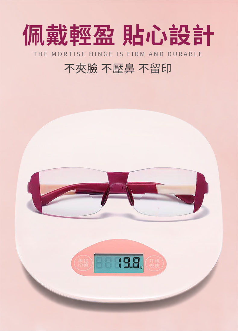 ?高清晰防蓝光镜片,耐腐蚀耐刮耐磨 ?防蓝光防辐射防紫外线防疲劳,看远看近都非常清楚 ?100%防紫外线,3-5年之内不会发黄 ?不易折断不压鼻子没有螺丝 ? 磁石加速血液循环,降低疲劳感